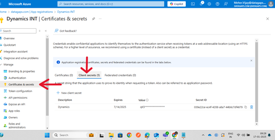 - Create a new client secret and note it down as it will not be visible again.