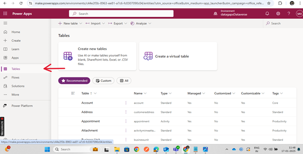 - Click on Tables to see the sample data available in Dataverse.